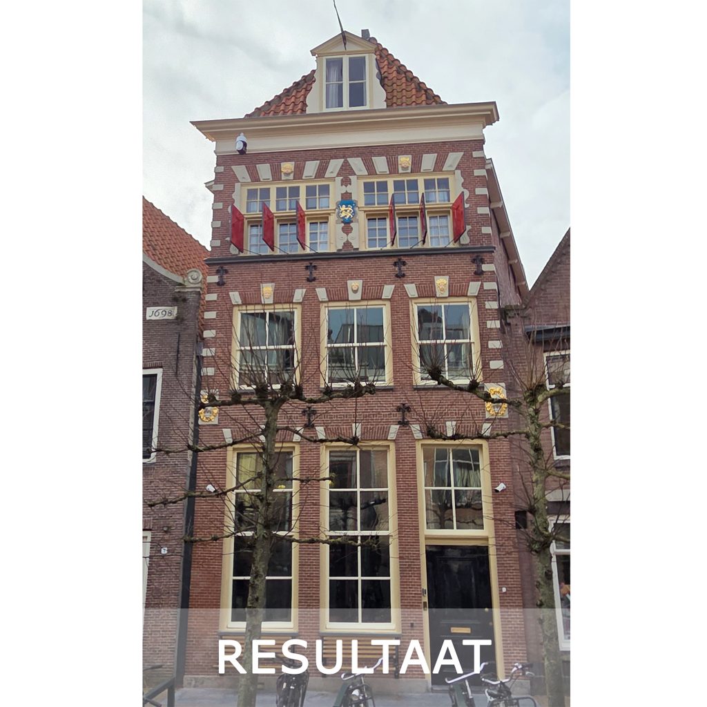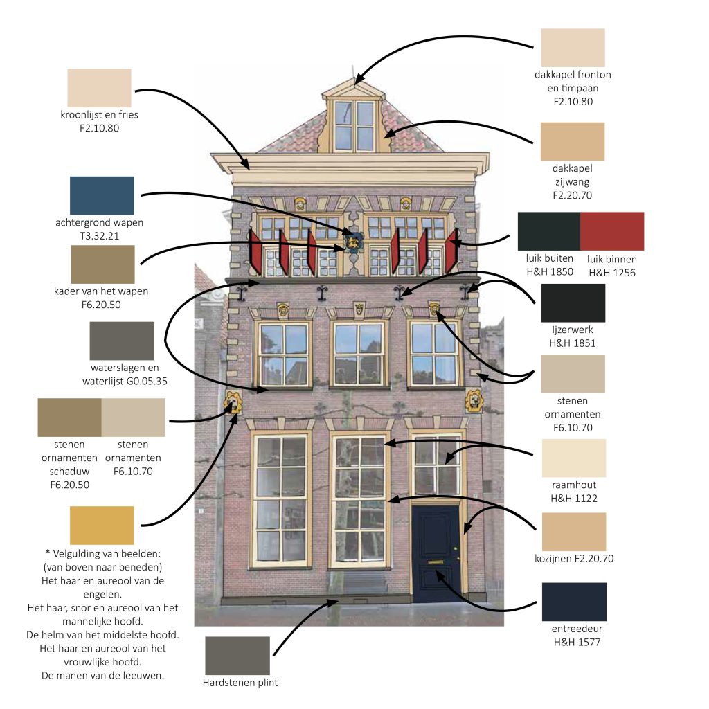 Op basis van het onderzoeksvoorstel zijn alle gevelelementen teruggebracht naar de oorspronkelijke kleuren die kenmerkend waren voor dit monumentale pand.